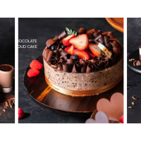 Serves 9-12. Mocha sponge cake layered with mocha cream, topped with caramel sauce, edible chocolate boards and nuts.